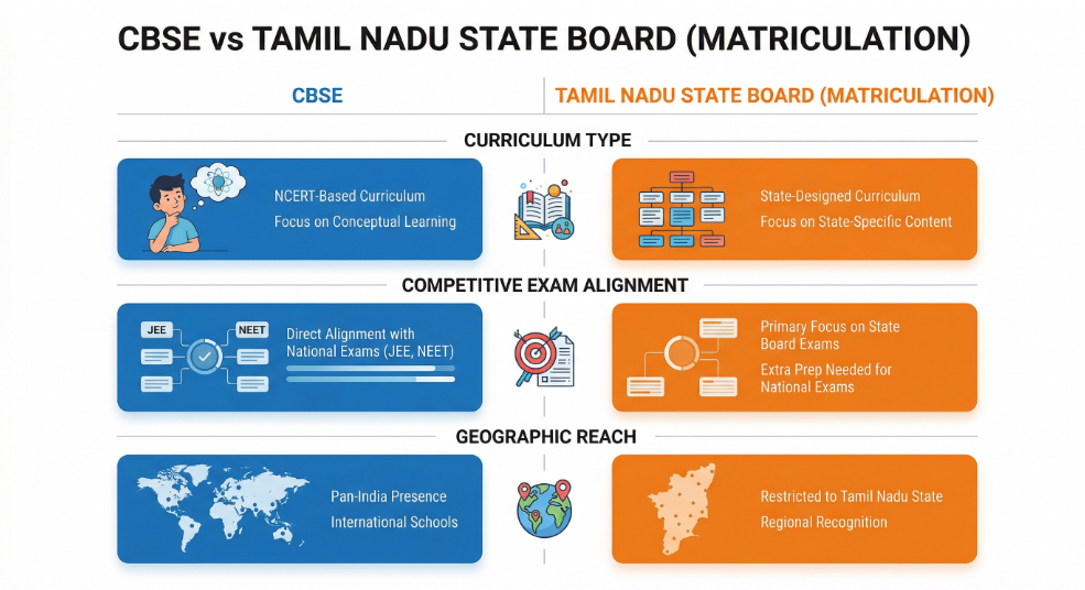 - ●Matriculation schools follow the Tamil Nadu State Board curriculum, which is more state-focused